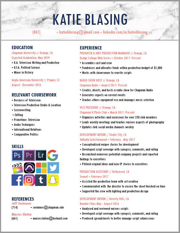 I designed my first resume in Adobe InDesign my freshman year of college. Since then, I've redesigned my own a few times, and I offered to create customized resume, cover letter, and business card designs for my friends, combining inspiration from Pinterest and each person's particular specifications.